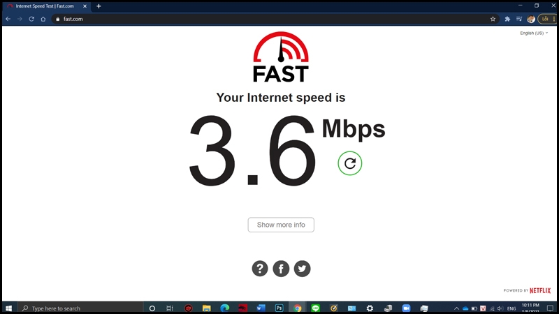 Bạn có thể sử dụng ứng dụng bên thứ ba như fast.com hoặc các ứng dụng đo đạc tốc độ đường truyền khác. Nếu tín hiệu đang kém thì đây sẽ là lí do làm cho Meet của bạn không hoạt động được. Hãy thử truy cập vào mạng khác hoặc kiểm tra lại hộp phát WiFi nhé.